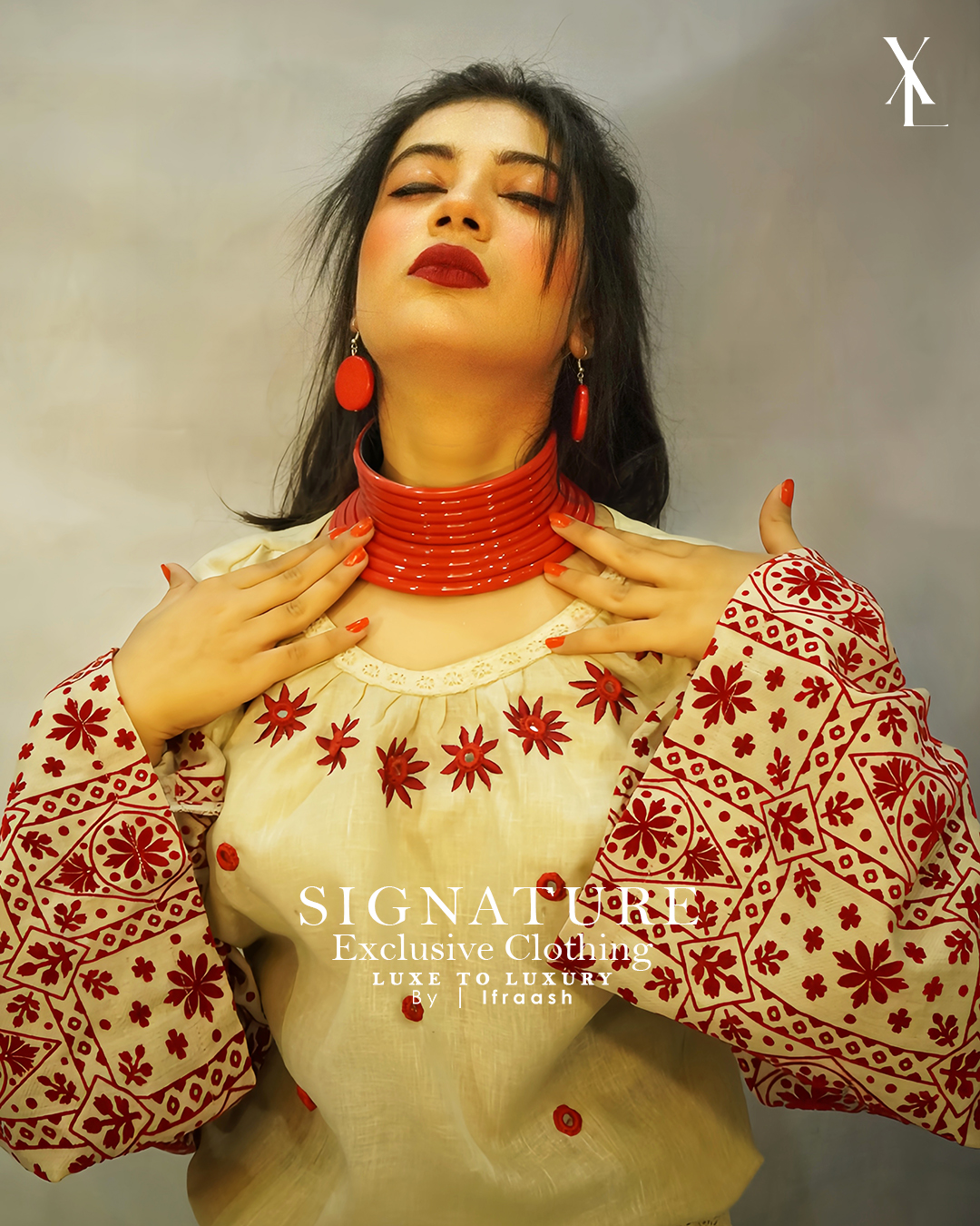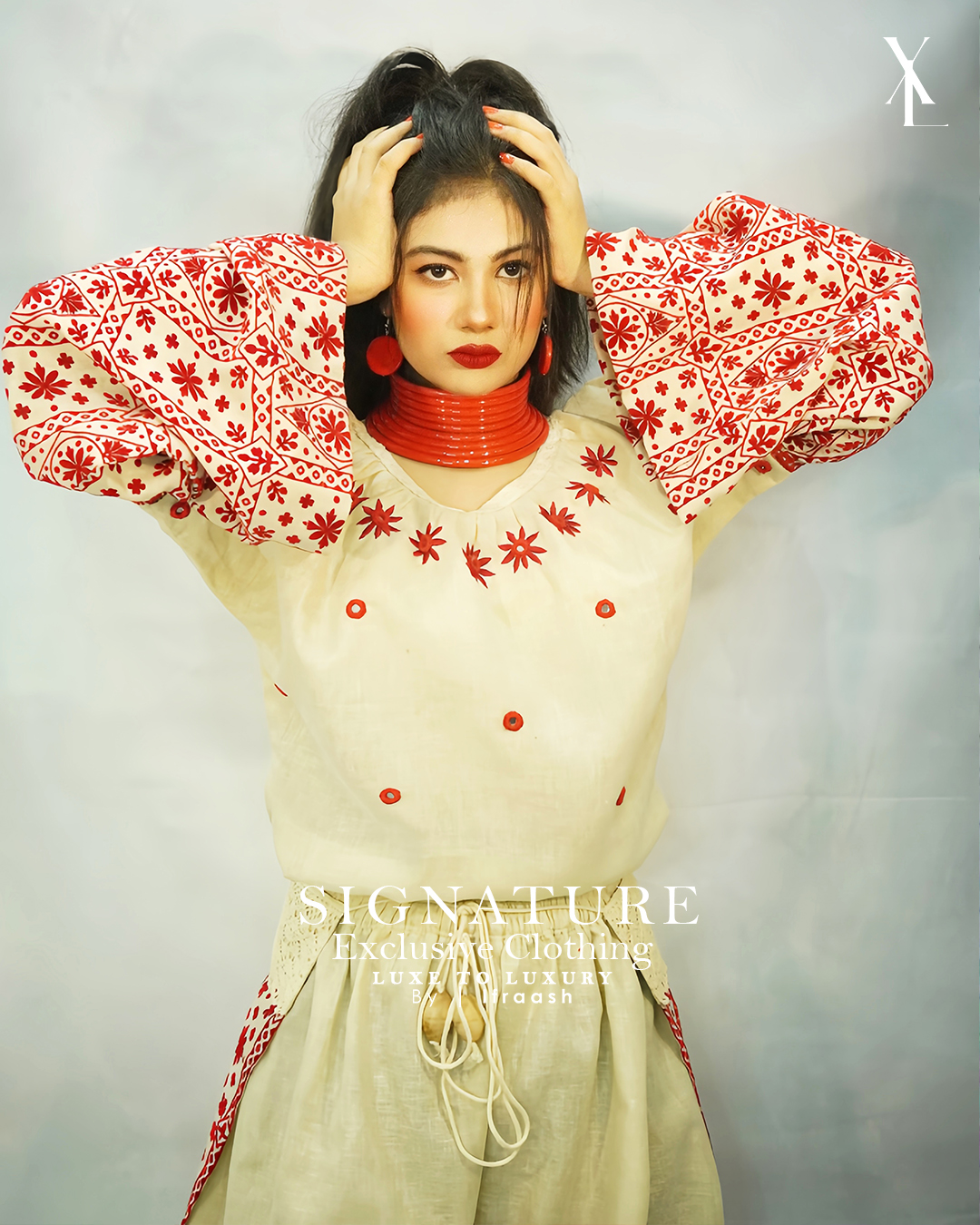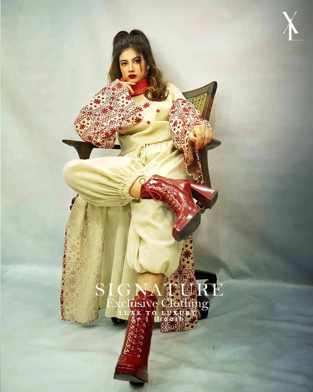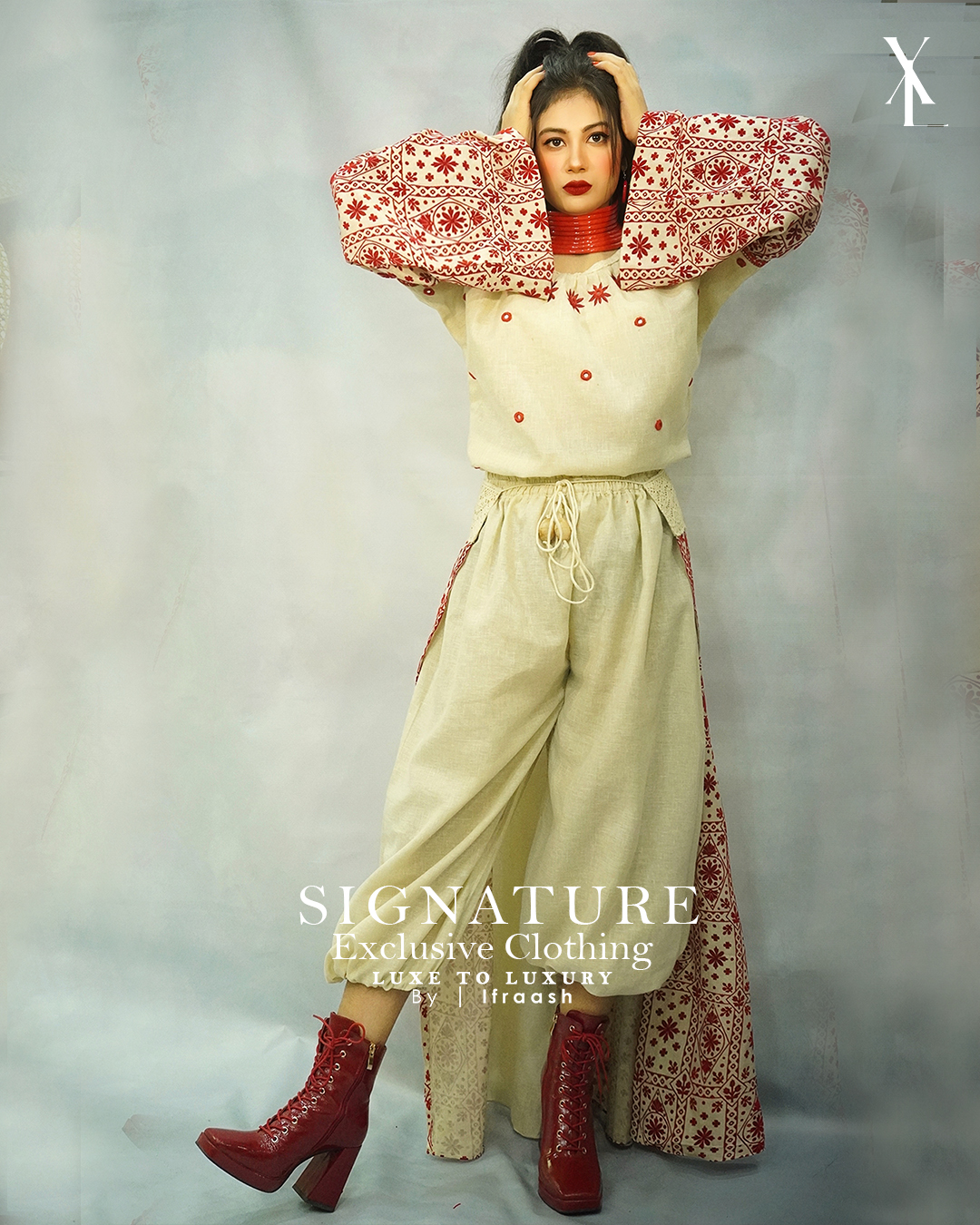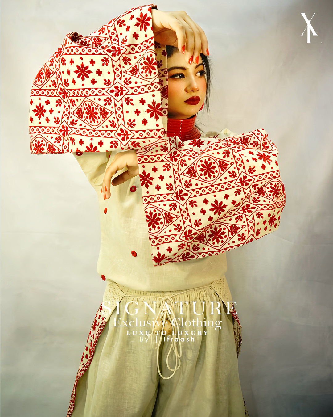 Intricately embroidered, featuring stunning mirror work on the sleeves and neckline. Added velvet patchwork also on the sleeves & Skirt for a touch of glam.